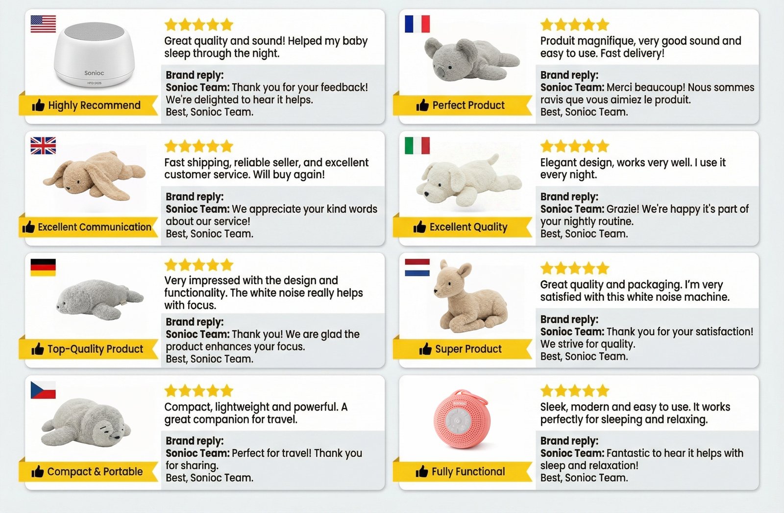 Showcasing global satisfaction from real users of the Sonioc White Noise Machine.